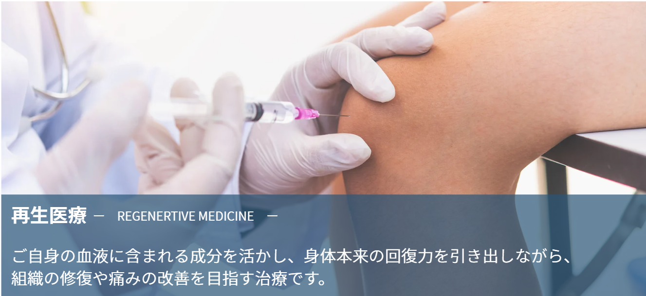 PRP療法は再生医療の一つです。アスリートなども活用する組織の再生を促す画期的な治療法です。ご自身の血液に含まれる治癒能力のある血小板を凝集させ、患部に注射します。成長因子を多く含み、傷の治りを促進する成長因子が含まれるPRPは、治癒能力や組織の修復能力、再生能力を引き出すと考えられております。